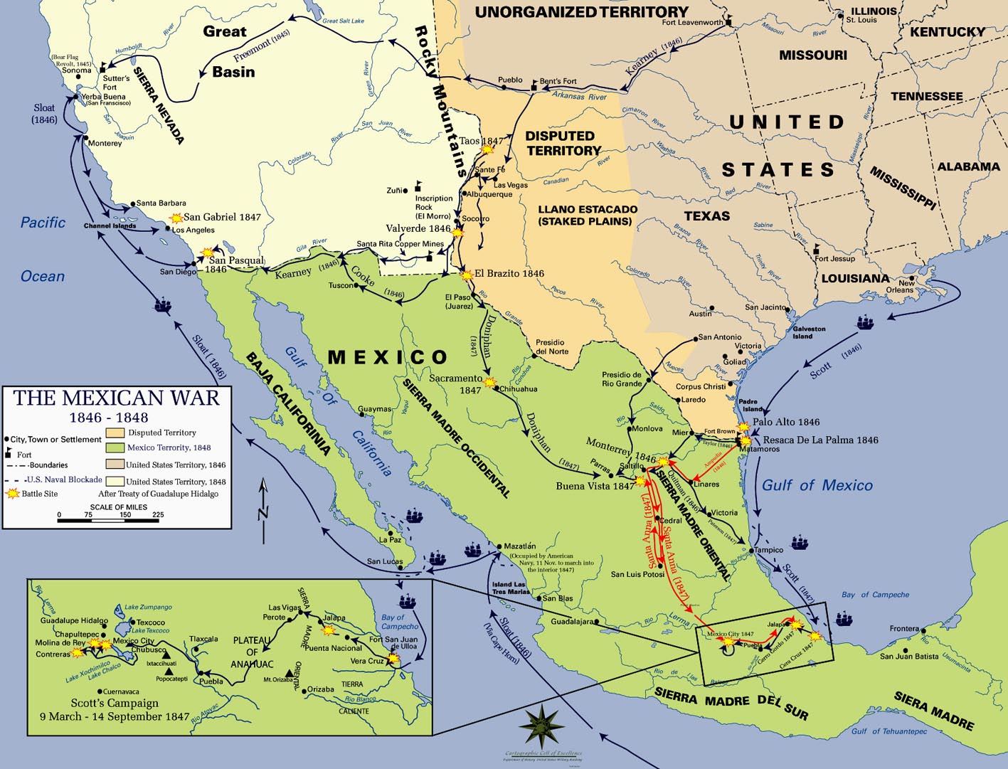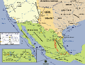Der Mexikanisch-Amerikanische Krieg zwischen den beiden Nationen Mexiko und USA fand zwischen 1846 und 1848 statt und wurde maßgeblich vom amerikanischen Präsidenten James K. Polk vorangetrieben. Er kam zustande, weil die USA zu Mexiko gehörige Gebiete beanspruchten. Die USA verlangten das Gebiet bis zum Rio Grande (auf Spanisch „Río Bravo del Norte“, übersetzt: „Wilder Fluss des Nordens“), Mexiko dasjenige bis zum Nueces River (aus dem Spanischen/Englischen übersetzt: „Nüsse-Fluss“). Die Republik Texas wurde am 1. März 1845 in die USA aufgenommen, nachdem sie 1836 ihre Unabhängigkeit von Mexiko gewonnen hatte (Texanischer Unabhängigkeitskrieg). Noch im März 1845 erreichten die USA unter General Zachary Taylor den Rio Grande. Nach dem Sieg in der Schlacht von Palo Alto am 8./9. Mai 1846 drängten sie Mexiko sogar bis hinter den Rio Grande zurück. Erst daraufhin erklärten die USA am 13. Mai 1846 Mexiko den Krieg. Taylor drang mit seinen Truppen weiter nach Süden vor und siegte bei Monterrey (August 1846) und Buena Vista (Februar 1847). Auch in Kalifornien erhoben sich anglo-amerikanische Einwanderer gegen den mexikanischen Staat. US-amerikanische Truppen eroberten daraufhin auch Kalifornien (Januar 1847 Besetzung von Los Angeles) und New Mexico. Die US-Flotte nahm die mexikanischen Häfen Tampico und Veracruz ein. Am 14. September 1847 besetzten die US-Amerikaner unter Winfield Scott schließlich Mexiko-Stadt. Der Vertrag von Guadalupe Hidalgo, mit dem der Krieg beendet wurde, wurde am 2. Februar 1848 geschlossen. Er enthielt im wesentlichen folgende Punkte: