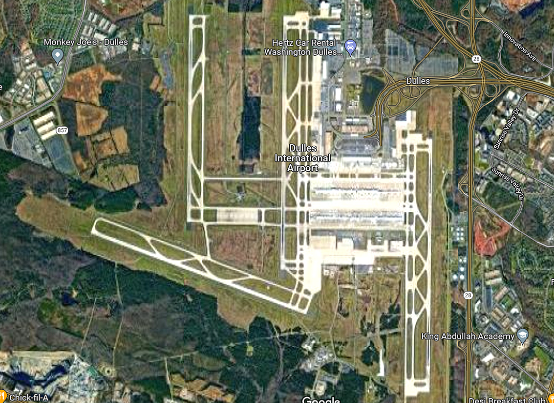 Das Flughafenareal ist etwa 45,26 km² (11.184 ac) groß und erstreckt sich über die Grenze von Fairfax County und Loudoun County.[2] Der Flughafen befindet sich zwischen zwei gemeindefreien Gebieten, Chantilly und Dulles, westlich von Herndon und südwestlich von Sterling. 1958 wurde das ehemalige gemeindefreie Gebiet Willard aufgelöst, um für Dulles Platz zu schaffen. Außerdem wurden zahlreiche Straßen, Häuser, Geschäfte und Schulen abgerissen, um Platz für die Landebahnen zu schaffen. Der Flughafen wurde am 17. November 1962 vom US-Präsidenten John F. Kennedy als Dulles International Airport eröffnet und im Jahr 1984 zu Washington Dulles International Airport ergänzt. |